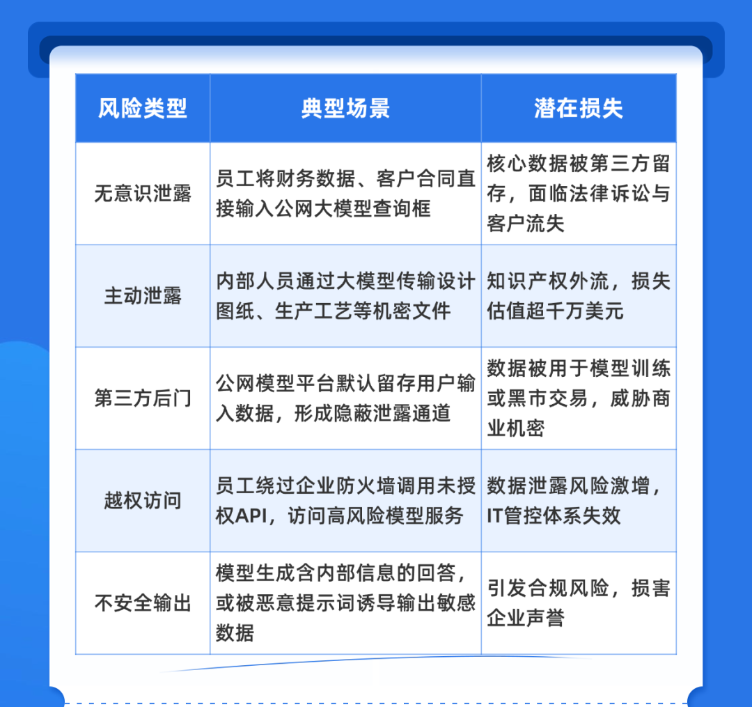 大模型在企业办公中的深度应用引发五类核心风险:无意识泄露、主动泄露、第三方后门、越权访问、不安全输出。这些风险可能导致企业面临技术壁垒崩塌、千万级罚款、供应链中断及客户流失等损失。