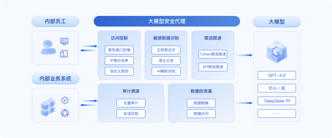 大模型安全代理通过对互联网上的大模型应用统一代理入口,提供针对大模型输入输出内容的合规审核、敏感数据识别、数据脱敏、访问控制、限流限速、审计溯源等安全能力,防止大模型应用带来的数据泄露和法律风险。