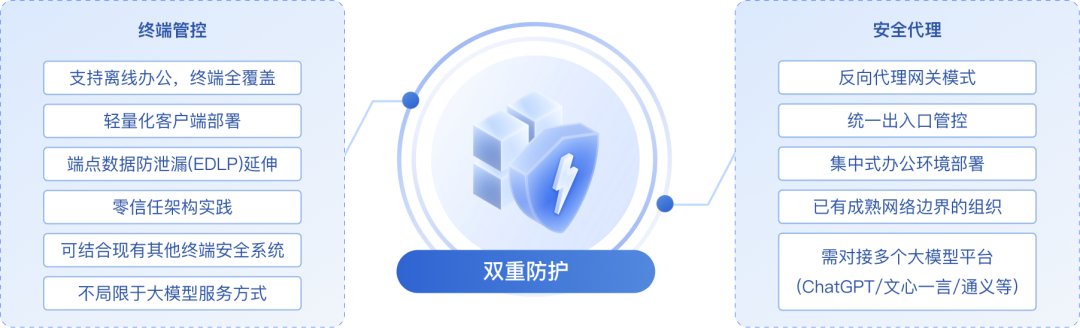 终端管控与安全代理两种方案,并非互斥关系,而是通过分层防护机制实现能力互补。终端管控,聚焦本地安全管控,从源头上阻断敏感数据外传;安全代理通过统一入口管控所有大模型请求,执行敏感数据动态脱敏、合规内容审核、全量审计溯源等操作。
