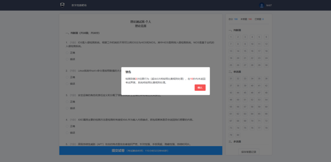 安恒信息为本次大赛提供了自主研发的网络安全竞赛平台,该平台全面承载了安全理论赛与安全防御赛两大环节,内置防切屏、自动交卷等严格的反作弊机制。平台全程运行稳定,确保了百余名选手同时在线答题、提交Flag的高并发场景下不卡顿、不丢数据,顺利完成全部比赛流程。