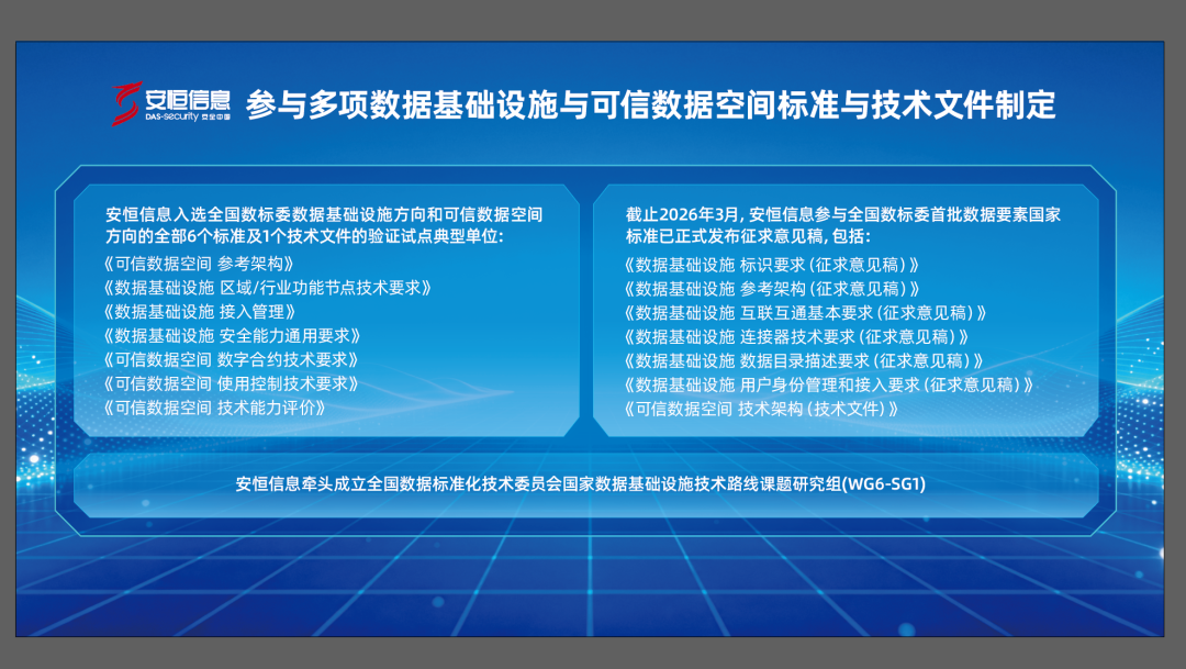一直以来,安恒信息以“标准引领、生态共建、安全护航”为准则,深耕数字基础设施建设与可信数据空间建设,深度参与多项数据基础设施与可信数据空间标准与技术文件制定,助力推动形成全国统一、互联互通的数据基础设施标准体系。